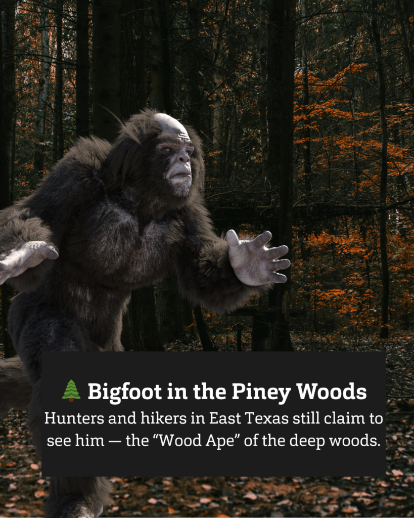The dense forests of East Texas are prime territory for Bigfoot sightings. Hunters, hikers, and even park rangers have reported seeing towering, hairy figures and hearing bone-rattling howls echoing through the trees. Texas takes Bigfoot seriously, so much so that Jefferson, Texas, hosts the Texas Bigfoot Conference each fall, where believers and skeptics alike gather to swap stories, share evidence, and celebrate the legend of the “Wood Ape.”
