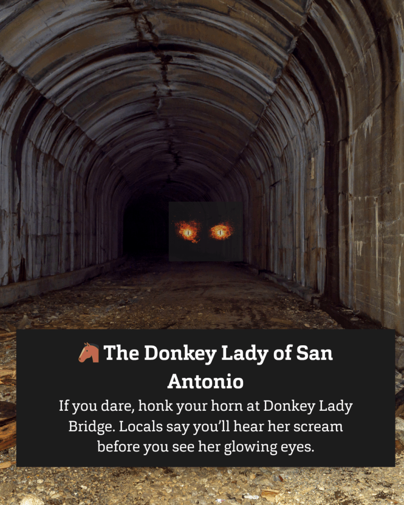 A mix of tragedy and urban legend, the Donkey Lady is said to haunt a bridge just south of San Antonio. The story goes that a woman, horribly burned in a fire, was left disfigured with an elongated face and hands that resembled hooves. Locals say if you stop on Donkey Lady Bridge at night, honk your horn, or call out to her you might just hear her shrieks or see glowing eyes staring back at you from the darkness.