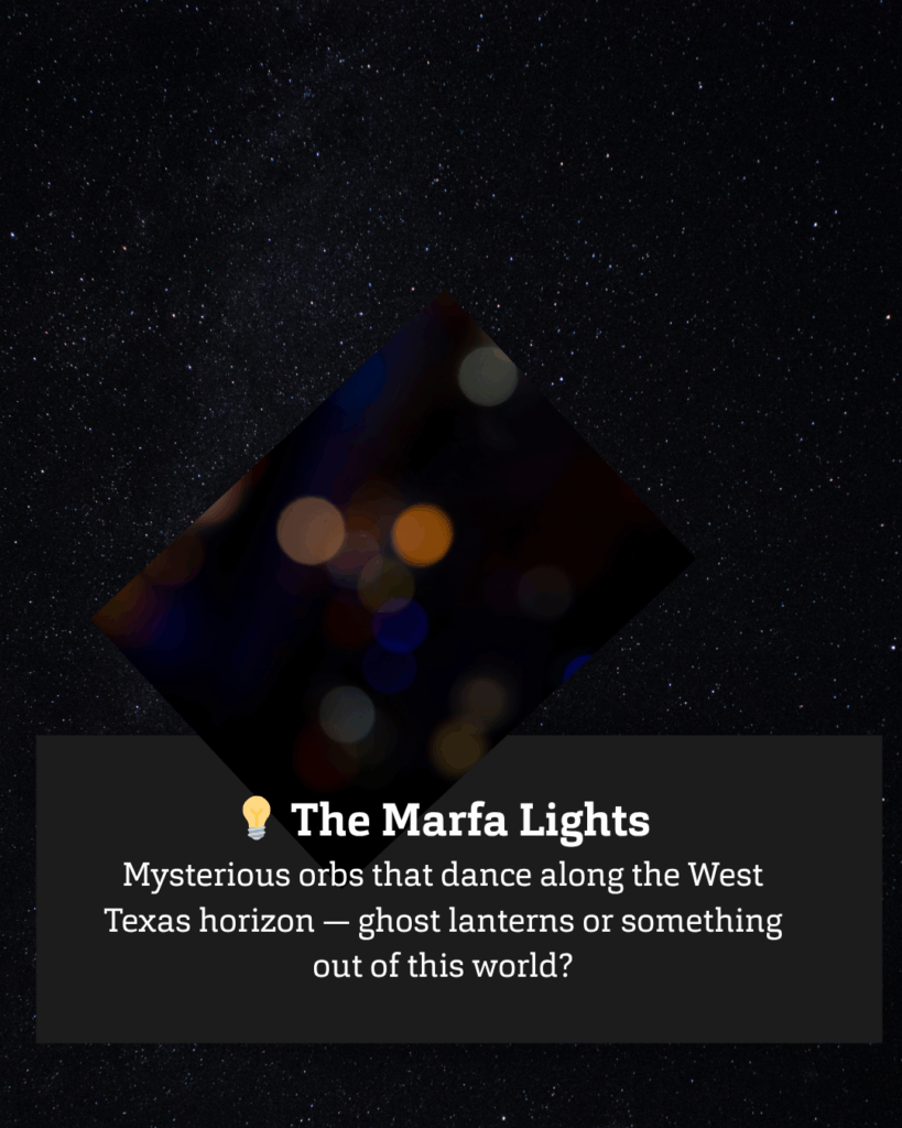 Out in far West Texas, near the small town of Marfa, strange glowing orbs have been spotted dancing along the horizon for over a century. The lights, sometimes red, blue, or white, appear without warning and move in ways that defy logic. Scientists chalk them up to atmospheric reflections, but locals know better. Whether ghostly lanterns, UFOs, or restless spirits, the Marfa Lights are one of Texas’ most enduring mysteries.